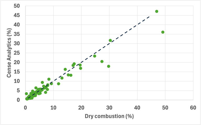 Cense Analytics’ measurement team has been actively advancing forest soil carbon assessment through extensive fieldwork and technology development in southern Finland. Operating across diverse boreal forest types in different stages of maturity the team has conducted systematic soil sampling campaigns aimed at refining both sampling protocols and Cense Analytics’ on-site soil organic carbon (SOC) measurement techniques. Using a combination of traditional soil core sampling and the portable laser-based measurement device we have developed a robust workflow for spatially representative forest soil carbon data collection. The achieved measurement accuracy on fresh soil samples is comparable to laboratory standard measurement with correlation factor of 0.95 across a wide dynamic range. Thus, this approach not only enhances the precision of soil carbon estimates but also reduces the time and cost associated with conventional methods. By integrating geospatial data and machine learning, Cense Analytics is further improving spatial upscaling, enabling more comprehensive regional assessments of forest soil carbon storage.